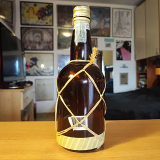 Bottiglia vuota di Rhum Black Joe, Original Jamaican Rum. - Etichetta con mappa della Giamaica. - Decorazione con corda di paglia.