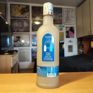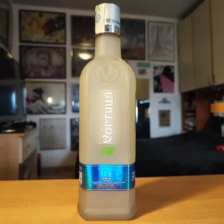Bottiglia di vodka Khortytsa Ice. - Bottiglia in vetro smerigliato. - Etichetta con dettagli blu e verdi. - Tappo argentato.