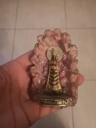 Delizioso soprammobile religioso, un ricordo di Loreto. - Base con scritta Ricordo di Loreto. - Figura centrale con aureola. - Decorazione con glitter rosa e argento. Bellissimo soprammobile religioso Madonna nera di Loreto In pietra Con sfumature rosa e lilla Con moltissimi brillantini Bellissima e di effetto