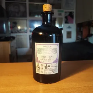Bottiglia vuota di Monkey 47. - Etichetta Schwarzwald Dry Gin. - Tappo in sughero. - Capacità 500 ml.