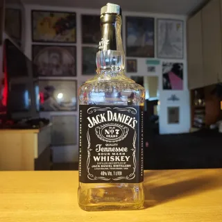 Bottiglia vuota di Jack Daniel's Tennessee Whiskey. - Etichetta Old No. 7 Brand con dettagli Tennessee Sour Mash Whiskey. - Capacità originale: 1 Litro. - Gradazione alcolica: 40% Vol.