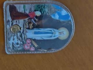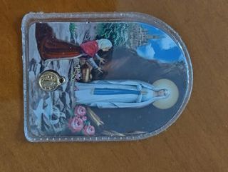 Immagine votiva della Madonna di Lourdes, completa di medaglietta. - Raffigurazione della Madonna di Lourdes. - Medaglietta dorata inclusa.