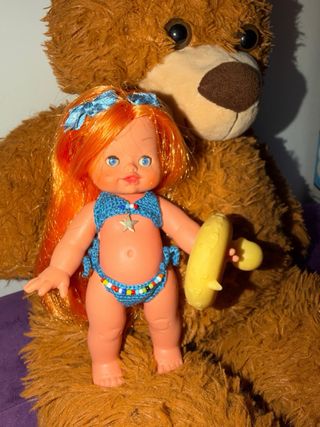 Bambola con capelli rossi e costume da bagno fatto all'uncinetto. - Costume blu con perline colorate. - Salvagente giallo incluso.