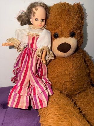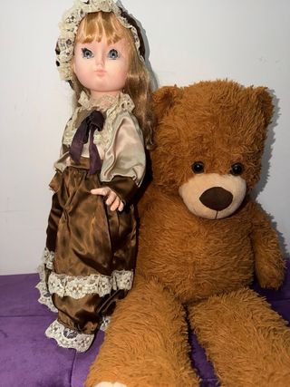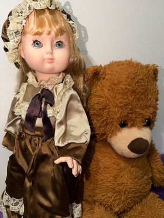 Bambola vintage con abito marrone e dettagli in pizzo, accompagnata da un morbido orsetto di peluche marrone. - Vestito in raso marrone con fiocco. - Cappellino con pizzo. - Orsetto di peluche morbido.