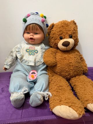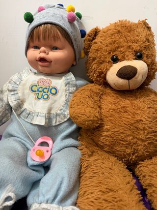 Bambola Cicciobello con un adorabile orsetto e ciuccio. - La bambola indossa un cappellino grigio con pompon colorati. - Ha un bavaglino bianco con la scritta Ciccio UO. - Indossa un pigiamino azzurro con dettagli a fantasia. - Il ciuccio rosa è attaccato con un filo.
