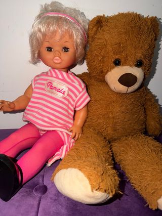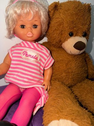 Bambola Pamela con un tenero orsetto marrone. La bambola indossa un vestito a righe rosa e bianche e calze rosa. - Bambola Pamela con nome sul vestito. - Orsetto marrone. - Vestito a righe rosa e bianche. - Calze rosa.