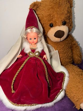 Bambola con un elegante abito da principessa rosso velluto, rifinito con dettagli dorati e pelliccia bianca. - Cappello a punta coordinato. - Collana di perle. - Dettagli dorati sul vestito.