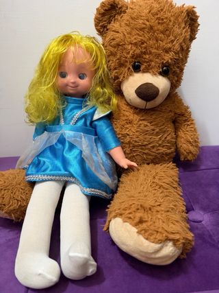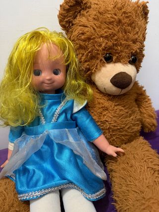 Bambola con capelli biondi e un grazioso vestito blu con dettagli argentati. Accompagnata da un morbido orsacchiotto marrone. - Vestito blu con gonna a balze. - Dettagli argentati sul colletto e sull'orlo. - Orsacchiotto in peluche marrone.