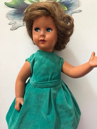 Bambola vintage con un grazioso vestito verde. - Occhi azzurri. - Capelli castani. - Vestito verde con cintura. - Calzini bianchi e scarpette verdi.