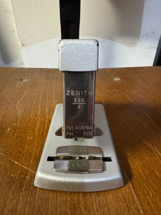 Puntatrice Zenith modello 520-E. - Design in metallo argentato. - Marchio Zenith inciso sulla base e sul corpo. - Dettagli con numeri di brevetto incisi: Pat. 406194 e Pat. 332. Nel mio armadio altre spillatrici se ne acquisti due sconto del 15% sul totale se ne acquisti 3 lo sconto e del 20%