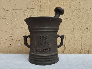 Premetto: la ditta che costruì questo oggetto chiuse nel 1999. Si tratta della Società Alsaziana Costruzioni Meccaniche, fondata nel 1826 da André Koechlin. Faceva parte del settore metalmeccanico. Si occupava di locomotive, caldaie, macchine utensili e tipografiche, motori diesel, armi da fuoco e attrezzature minerarie a Mulhouse in Alsazia. Trattasi di un mortaio in ghisa assemblato in due parti, di ottima fattura in quanto specie nelle lettere non vi sono imperfezioni o bolle d'aria. Quindi molto liscio per essere ghisa. Kg.2,280 Altezza cm.11 pestello cm.15