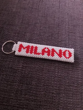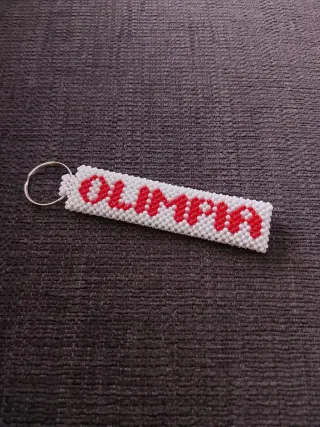 Portachiavi personalizzato con il nome Olimpia Milano. Realizzato con perline bianche e rosse. Anello in metallo Il prezzo si riferisce al singolo. Se si vogliono entrambi, prezzo trattabile