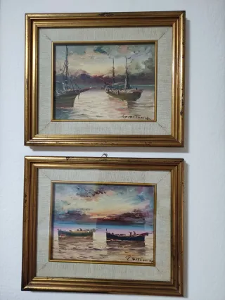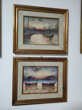 Bellissima coppia di quadri antichi, dipinti a mano con cura e attenzione ai dettagli. Dimensioni nelle foto. Cornice dorata foglia oro, passepartout in stoffa e vetro protettivo. - Scene marine con barche al tramonto. - Cornici dorate eleganti. - Firmati dall'artista.