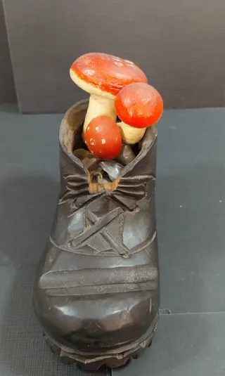 Soprammobile Vintage (anni 60) costituito da un piccolo Scarpone in Legno lavorato a mano, con inseriti dei piccolo funghetti Dimensioni 8,5x11,5x5 cm