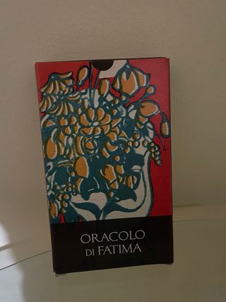 Carte dell'Oracolo di Fatima. - Illustrazione di un bambino con trombe. - Scritta ORÁCOLO DI FATIMA sul fondo nero.