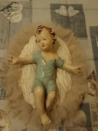 Antico bambinello realizzato in cemento bianco con finiture dettagliate. Dipinto in un secondo momento come pure il cuscino. Misura 33 x 27 - Vestito con una tutina azzurra. - Capelli riccioli castani. - Posizionato su un cuscino decorato.