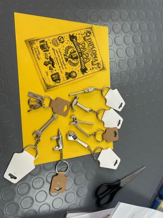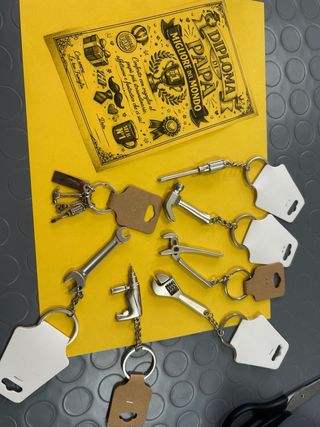Scegli il tuo portachiavi a tema Festa del Papà, perfetti per celebrare. - Include un diploma Migliore del Papà del Mondo. - ciondolo a forma di attrezzi da lavoro: chiave inglese, martello, pinza, trapano. - Ogni portachiavi ha un'etichetta bianca vuota per personalizzare.