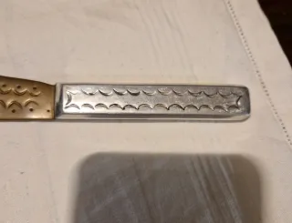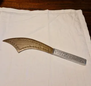 Originale lama decorativa ( probabilmente apri-busta) realizzata in metallo con lavorazione punzonata. Oggetto vintage ornamentale, con lama non affilata, della seconda metà del '900. Adatto per collezionisti o per arredamento rustico/etnico. Lunghezza totale cm 23.