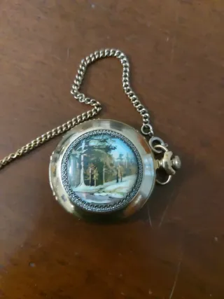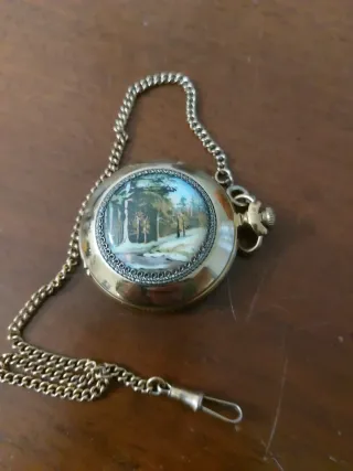 Elegante orologio da tasca a cipolla di origine russa, completo di catena. - Cassa in metallo dorato. - Quadrante decorato con un paesaggio. - Catena in metallo coordinata. - Carica Manuale