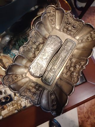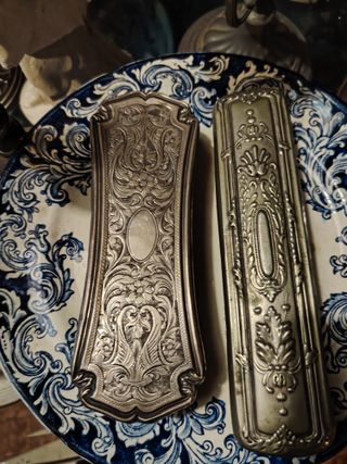 Elegante set di spazzole antiche, mai utilizzate. Ideali per collezionisti o come pezzo d'arredo. - Design decorato con motivi floreali. - Materiale: metallo argentato. - Finitura lucida.