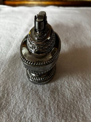 Elegante accendino da tavolo vintage MTC, un pezzo da collezione con un design ricercato. - Materiale metallico finemente lavorato. - Base decorata con motivi classici. - Parte superiore con meccanismo per accensione.