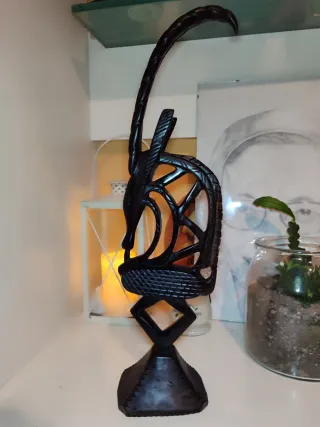 Vendo bellissimo Chiwara in legno intagliato a mano, un pezzo unico e autentico che aggiunge un tocco di eleganza africana alla tua casa, Altezza: 50 cm, larghezza base 7 cm, larghezza chiwara 13 cm, - Materiale: Legno scuro - Design: Figura stilizzata di un animale con corna lunghe e curve, veramente bello e conservato come nuovo.