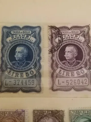 Lotto di marche da bollo del Regno d'Italia. - Tassa di Bollo Scambi Commerciali - Lire Venti - Lire Dieci - Lire Cinque - Lire Due - Lire Una - Centesimi 10 - Centesimi 20 - Centesimi 30 - Centesimi 50