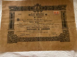 Diploma di laurea originale, rilasciato negli anni ’30, su carta pergamenata di grande formato, completo di firme originali e marche da bollo. conservato con cura, appartenuto a Felice Lapi, che si trasferì a Trieste per completare i suoi studi universitari dopo aver frequentato in precedenza la Scuola Normale di Pisa, lasciò la Toscana, e in particolare Santa Croce sull’Arno, per prendere le distanze dal clima politico locale dell’epoca, non condividendone l’orientamento. A Trieste conobbe Remigia, mia prozia, si sposò, stabilendo definitivamente la propria vita e attività professionale in città. Misure: 52 × 37 cm