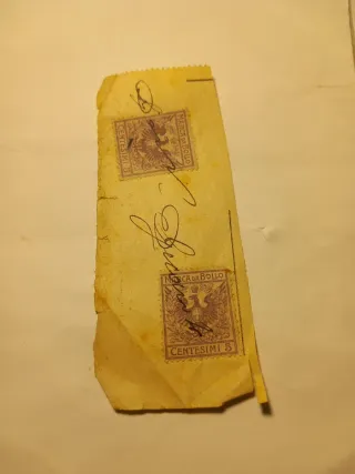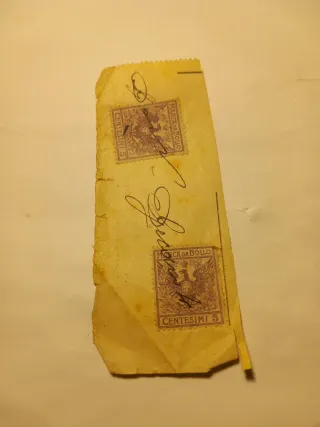 Due francobolli italiani del 1896, "Marca da bollo", da 5 centesimi. Sono applicati su un frammento di documento antico. Mostrano segni del tempo, ma sono in buone condizioni generali per la loro età. Annullo a mano