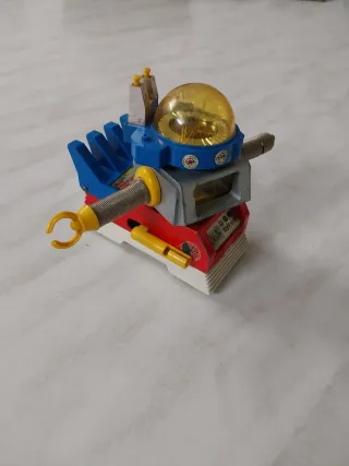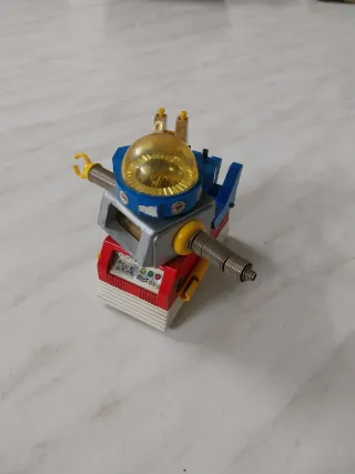 Un robot giocattolo da collezione, con un design unico e colorato. - Base rossa con dettagli bianchi e pulsanti. - Corpo centrale grigio e blu. - Cupola trasparente gialla. - Braccio con pinza gialla. - Molla metallica su un lato.