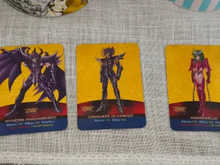 Set di carte da gioco dei Cavalieri dello Zodiaco. - Carta Wyvern Rhadamante - Carta Cavaliere di Cancer - Carta Andromeda