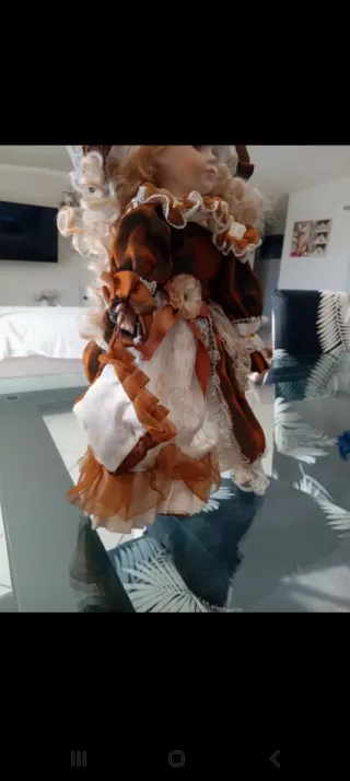 Bellissima bambola da collezione in porcellana, con un abito dettagliato e un cappello elegante. - Dettagli in pizzo sull'abito. - Capelli lunghi e biondi. - Espressione facciale delicata.