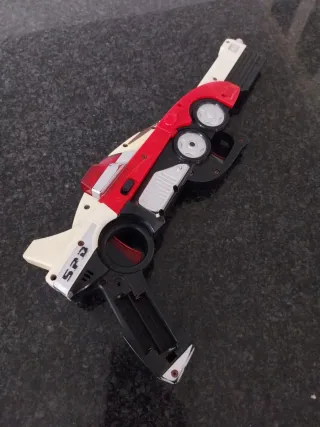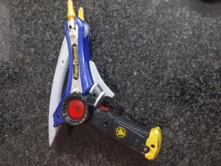 Un giocattolo da collezione ispirato ai Power Rangers. Presenta un design colorato con dettagli iconici. - Lama grigia curva. - Impugnatura nera con simbolo giallo. - Dettagli blu e rossi.