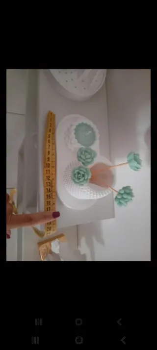 Set di decorazioni in gesso, perfette per aggiungere un tocco di stile alla tua casa. - Candela bianca intrecciata. - Vaso bianco con decorazione a rombi. - Fiori decorativi verdi a forma di succulenta.