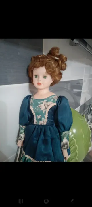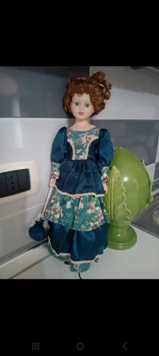 Deliziosa bambola di porcellana con un elegante vestito. - Dettagli del viso dipinti a mano. - Capelli castani raccolti. - Abito in tessuto blu e verde con fantasia floreale. - Include un piccolo ombrello abbinato.