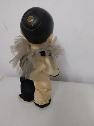 Bambola da collezione con un design da clown malinconico. - Vestito bicolore bianco e nero. - Collo a balze in tulle. - Dettagli dipinti sul viso.