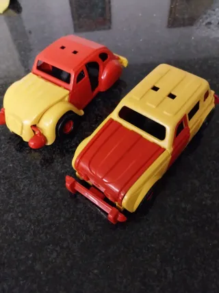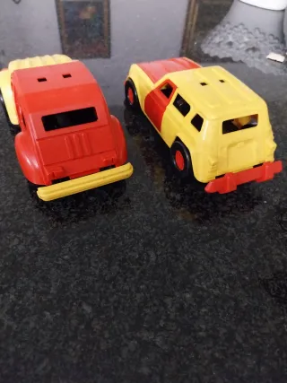 Set di due macchinine giocattolo in plastica, con combinazione di colori rosso e giallo.NON COMPLETE MA IN BUONE CONDIZIONI - Una macchinina ha la carrozzeria rossa e il cofano giallo. - L'altra macchinina ha la carrozzeria gialla e il cofano rosso.