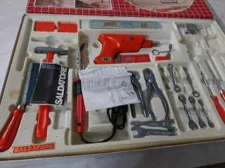 Set di attrezzi per modellismo Hobby Drill. - Include trapano, saldatore e vari accessori. - Scatola originale con immagini illustrative.