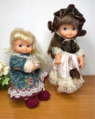 Lotto composto da due bambole Fiba Miss Flower, risalenti agli anni '70. Le bambole sono realizzate in plastica e tessuto. - Bambola con capelli biondi e abito verde floreale. - Bambola con capelli castani, cappellino marrone e abito rosa.
