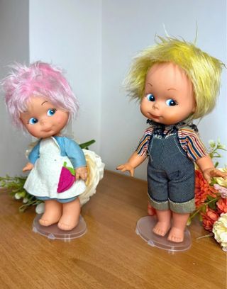 Lotto composto da 2 bambole della serie Sorrisini Fiba. - Bambola con capelli rosa e grembiule bianco con fragola. - Bambola con capelli biondi e salopette di jeans Buone condizioni come da foto necessitano di piccolo restauro ai capelli 💞i supporti non sono inclusi