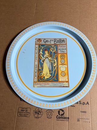 Vassoio pubblicitario vintage Gio. & F.lli Buitoni, con un design Art Nouveau che richiama un catalogo di specialità. - Raffigura una figura femminile con spighe di grano. - Presenta scritte Catalogo Specialità, Gio. & F.lli Buitoni, Paste Alimentari. - Indicazioni di fabbriche a Sansepolcro, Perugia e Città di Castello. - Bordi decorati con motivi floreali. - Colore di fondo azzurro pastello con dettagli in giallo ocra. 🥇- Si accettano offerte congrue all’oggetto. 📬- Servizio di spedizione entro 24/48 ore dal pagamento. 📱- Per info chiedete senza problemi #vassoio #tray #legno #homedecor #artigianato #handmade #madeinitaly