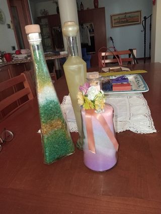 Tre bottiglie da ornamento per il bagno. Molto colorate.
