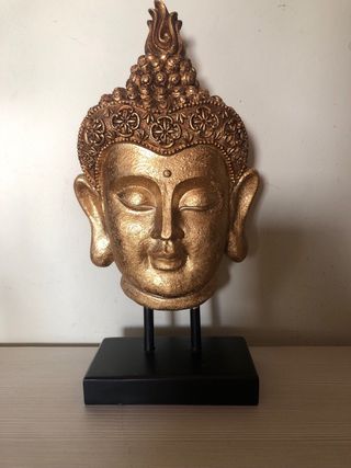 Bellissima statua a forma di testa di Buddha, con finitura dorata. - Dettagli elaborati sulla corona. - Supporto nero incluso