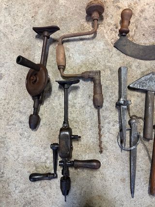 In vendita lotto di strumenti antichi • 2 trapani manuali antichi • Trapano/broca manuale • Spazzola di falegname metallica • Mezzo luna antica • Martelli vari • Pinze da fabbro (grande e piccola) • Punzoni e vari strumenti antichi Strumenti originali, ideali per collezione, decorazione o uso tradizionale. Con usura e ruggine superficiale tipica degli anni. • Prezzo lotto: 170€ Ritiro a Ceceñas.