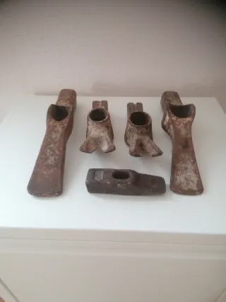 Set di 4 martelli antichi per saldare stagno. Ideali per collezionisti o appassionati di restauro. Sono di diverse dimensioni e presentano segni di utilizzo e usura, che conferiscono loro un aspetto rustico e autentico. Con segni di utilizzo e necessità di restauro. - 4 martelli in totale. - Manici in legno. - Teste di diverse forme e dimensioni. - Segni di ruggine e usura dovuti al passare del tempo. Le foto fanno parte della descrizione del prodotto.