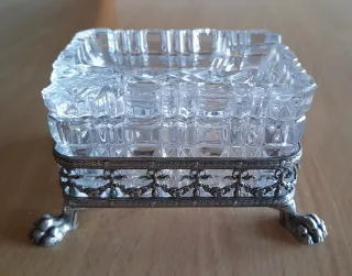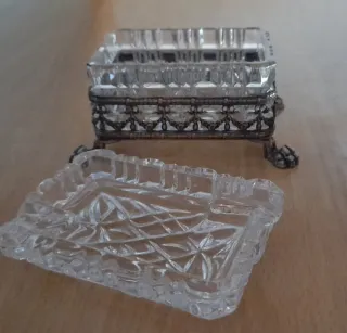 Bellissimo oggetto vintage da collezione in argento Sterling 82 vetro/cristallo dove sotto venivano conservate le sigarette e sopra veniva utilizzato come posacenere. Il posacenere presenta una scheggiatura in un angolo come da foto. Con certificato di garanzia collezione d'arte Élite da parte della gioielleria che lo ha venduto. Misure lunghezza 10 cm larghezza 8 cm e altezza 5,5 cm