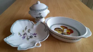 Una mini zuppiera Laurus diametro 10 cm, una piccola terrina Amanita 18x14 cm, un piattino a foglia Malva che presenta una sbeccatura come da foto 19x21 cm
