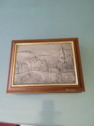 Elegante soprammobile portaoggetti con un suggestivo bassorilievo. - Raffigura un paesaggio montano con ponte e campanile. - Cornice in legno color noce. - Firma Horoui incisa sul bordo.