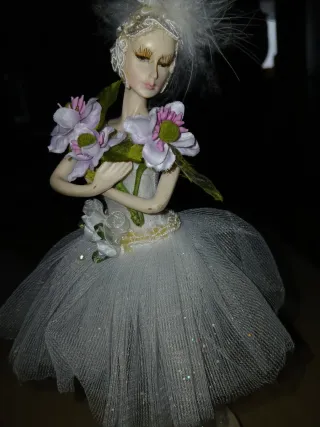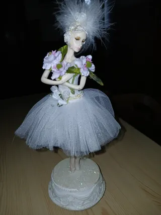 Deliziosa ballerina carillon, perfetta come elemento decorativo. - Dettagli floreali sul corpetto. - Tutù in tulle bianco. - Base decorata con glitter.