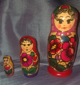 Vendo tre bambole russe (matrioske) in legno, dipinte a mano con dettagli incantevoli. Ogni pezzo si incastra in un altro, creando un set decorativo ideale per collezionisti o per decorare. Materiale: legno. Set di tre pezzi. Buono stato: la vernice non è molto usurata, non si notano crepe importanti. Molto decorative, perfette per scaffali o come pezzo da collezione.